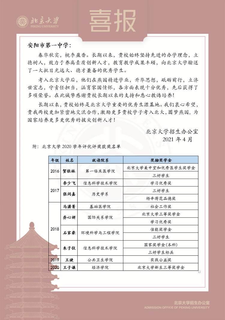 北京大學(xué)向我校發(fā)來喜報(bào)。在2020學(xué)年的北京大學(xué)評(píng)優(yōu)評(píng)獎(jiǎng)中,我校畢業(yè)生賀依林、李少飛、張潤嘉、馬瀟菁、喬心妍、石家豪、朱子儀、王婕、王子謙等多位同學(xué)獲獎(jiǎng)。 2013年以來,我校共有100名同學(xué)考入北大清華,一本上線率穩(wěn)定在92%以上。同學(xué)們進(jìn)入高校后,依然秉承安陽一中學(xué)生的優(yōu)良品質(zhì),精進(jìn)學(xué)業(yè),立濟(jì)世宏志,守責(zé)任擔(dān)當(dāng),涵育家國情懷,各方面表現(xiàn)突出。 我校將繼續(xù)深化教育改革,加強(qiáng)素質(zhì)教育,不斷提高辦學(xué)水平,為高校輸送更多的優(yōu)秀人才,努力辦好人民滿意的教育。 |