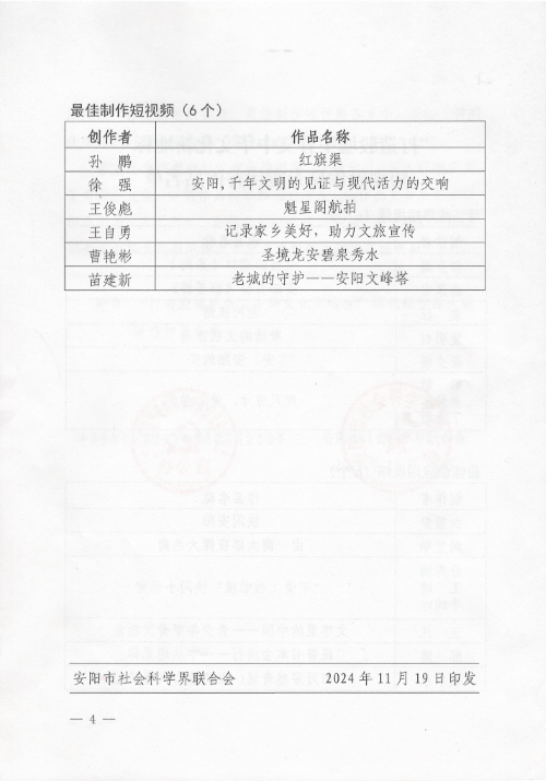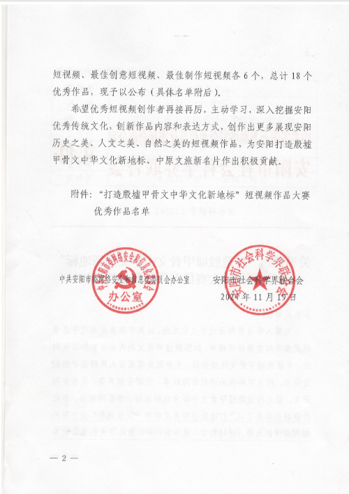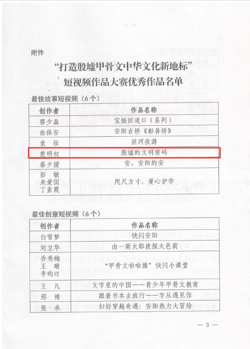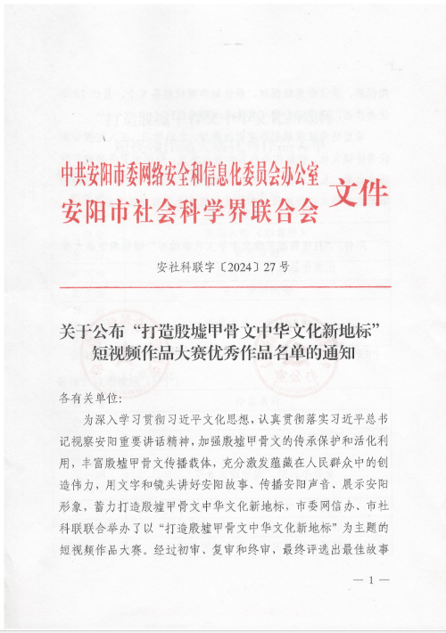 近日,中共安陽市委網(wǎng)絡(luò)安全和信息化委員會(huì)辦公室、安陽市社會(huì)科學(xué)界聯(lián)合會(huì)聯(lián)合下發(fā)了《關(guān)于公布“打造殷墟甲骨文中華文化新地標(biāo)”短視頻作品大賽優(yōu)秀作品名單的通知》(安社科聯(lián)字〔2024〕27號(hào)),我校作品《殷墟的文明密碼》經(jīng)過初審、復(fù)審和終審,被評為最佳故事短視頻。