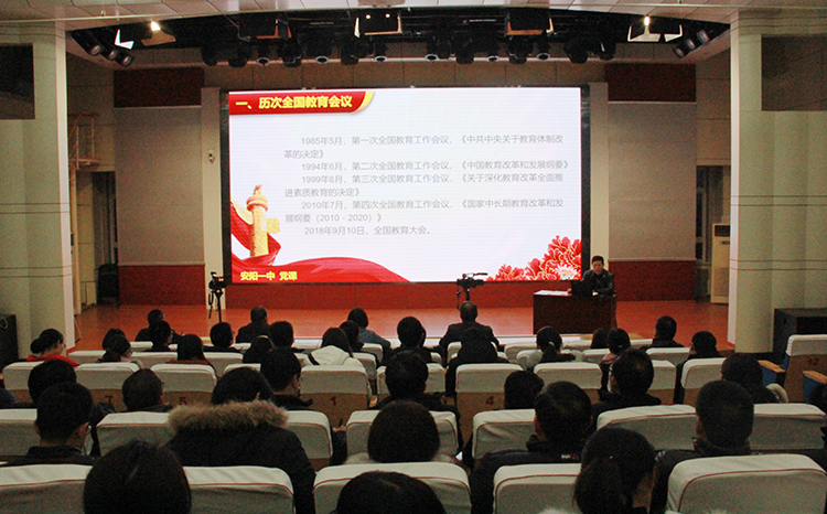 為全面落實全國教育大會精神,12月20日下午,利用本月“黨員活動日”時間,我校黨委委員、副校長王國卿在電教樓報告廳為全體黨員上黨課《學習貫徹全國教育大會精神,做新時代“四有”好老師》。 王國卿同志帶領全體黨員,重新學習了習近平總書記在全國教育大會上的重要講話精神,進一步強調了教育改革發(fā)展“九個堅持”、“六個下功夫”、“克服五個唯”、“扣好人生第一顆扣子”等新思想新觀點,并和在座的教師黨員們重新探討了“培養(yǎng)什么人,怎樣培養(yǎng)人,為誰培養(yǎng)人”這一根本問題,希望老師們能夠將“立德樹人”融入思想道德教育、文化知識教育、社會實踐教育各環(huán)節(jié),堅持四個相統(tǒng)一,爭做“四有”好老師。 黨員同志們邊聽邊記,聚精會神,獲益匪淺,進一步明確了今后工作的努力方向。作為教育工作者,全體黨員教師將承擔起應有的使命和責任,為安陽一中的發(fā)展做出應有的貢獻。