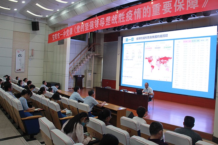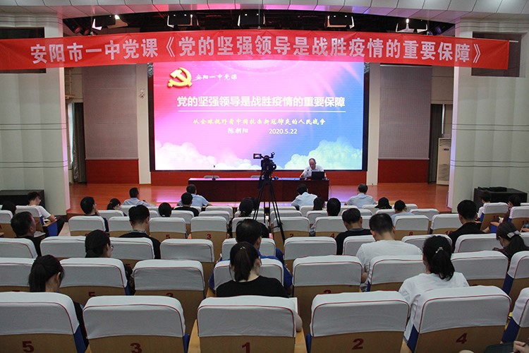 2020年5月22日下午,我校黨委委員、副校長陳朝陽在電教樓5樓報告廳為一中全體黨員作了題為《黨的堅強(qiáng)領(lǐng)導(dǎo)是戰(zhàn)勝疫情的重要保障》的主題黨課,從全球視野展現(xiàn)中國抗擊新冠肺炎的人民戰(zhàn)爭。安陽市第一中學(xué) 黨課分為全球抗疫形勢及我國抗疫工作回顧,中國取得初步勝利的原因及防疫工作的長期性、復(fù)雜性,新冠肺炎疫情工作對世界的影響,從疫情得到的啟示四個部分。李文亮、張靜靜、段正澄、徐輝……這些平凡而偉大的抗議英雄的名字和故事,讓大家深受感動。黨員們表示從他們的身上汲取了力量,也更堅定了戰(zhàn)勝新冠肺炎疫情的信心與勇氣。安陽市第一中學(xué) 陳校長還為大家講述了安陽一中人積極投入抗疫的故事。在停課不停學(xué)的日子里,老師們通過網(wǎng)上教學(xué),在家備課錄課,清早打卡,深夜答疑;電教老師全天候提供視頻制作技術(shù)支持;總務(wù)處四處籌措防疫物質(zhì),進(jìn)行場地消毒……這些安陽一中人點點滴滴的努力,使我校開學(xué)各項工作有序進(jìn)行,受到了到社會各界的廣泛關(guān)注和肯定。安陽市第一中學(xué) 全體黨員仔細(xì)聽講,認(rèn)真記錄,達(dá)到了良好的學(xué)習(xí)效果。我校將繼續(xù)加強(qiáng)黨員學(xué)習(xí)教育,讓黨員們不斷增強(qiáng)“四個意識”,堅定“四個自信”,做到“兩個維護(hù)”,堅定信念、勇于擔(dān)當(dāng),為戰(zhàn)勝疫情貢獻(xiàn)自己的力量。 |