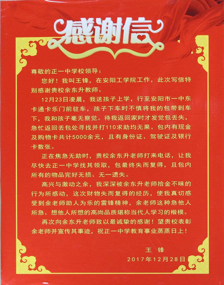 2017年12月23日早晨,余東升老師(現(xiàn)在安陽正一中學(xué)校區(qū)工作)送孩子上學(xué)途中行至卡通卡樂門店前撿到一個(gè)錢包,內(nèi)有現(xiàn)金、身份證、有價(jià)證券以及多張銀行卡等物品。為將錢包在第一時(shí)間歸還失主,余老師讓孩子自行上學(xué),原地等待失主十?dāng)?shù)分鐘。在沒有等到失主的情況下,他才匆匆趕去上班。當(dāng)天課后,余老師先后撥打114、12580,終于與失主取得聯(lián)系,將錢包完璧歸趙。失主要重謝余老師,被余老師婉拒。2018年1月8日上午,失主王鋒將感謝信送到我校,學(xué)校才了解了事情的經(jīng)過。