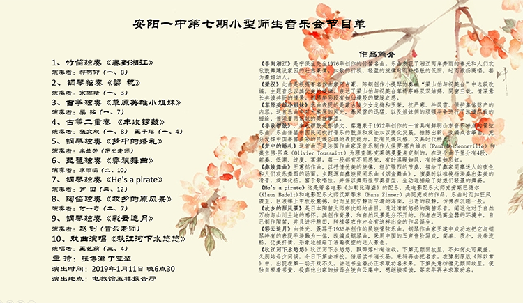 我校于2019年1月11日在電教樓五樓報(bào)告廳舉辦了新年師生音樂(lè)會(huì)。 由11位學(xué)生及教師組成的演員團(tuán)隊(duì)為大家呈現(xiàn)了一場(chǎng)精彩紛呈的音樂(lè)盛宴。一首竹笛演奏《春到湘江》拉開(kāi)了音樂(lè)會(huì)的序幕,清脆悅耳的竹笛聲如歌如訴,娓娓道來(lái);當(dāng)經(jīng)典曲目《梁祝》那熟悉的旋律響起,鋼琴上柔潤(rùn)與激情的碰撞,讓人久久不能平靜;《草原英雄小姐妹》、《豐收鑼鼓》的古箏表演時(shí)而溫柔平靜,時(shí)而灑脫奔放;琵琶獨(dú)奏《彝族舞曲》熱烈中隱有鼓點(diǎn)聲聲,將作品富有神韻地呈現(xiàn)出來(lái);充滿畫(huà)面感的鋼琴獨(dú)奏《He's a pirate》似乎真的帶來(lái)一場(chǎng)狂風(fēng)暴雨;陶笛獨(dú)奏《故鄉(xiāng)的原風(fēng)景》空靈的笛聲悠揚(yáng)婉轉(zhuǎn),讓人感覺(jué)身臨其境一樣;辛蘭芳老師和趙釗老師帶來(lái)的鋼琴獨(dú)奏《夢(mèng)中的婚禮》、《彩云追月》讓大家看到了老師多才多藝的一面;最后由王藝萌同學(xué)表演的豫劇選段《秋江河下水悠悠》,讓觀眾近距離感受到了我國(guó)傳統(tǒng)戲曲文化的獨(dú)特魅力。中西音樂(lè)的交融與綻放讓音樂(lè)會(huì)高潮迭起,掌聲不斷。 我校定期舉辦的音樂(lè)會(huì),不僅豐富了校園文化,更為師生提供了展示自我的平臺(tái),讓大家了解音樂(lè)會(huì),參與音樂(lè)會(huì),享受音樂(lè)會(huì),為校園素質(zhì)教育增添精彩的華章。