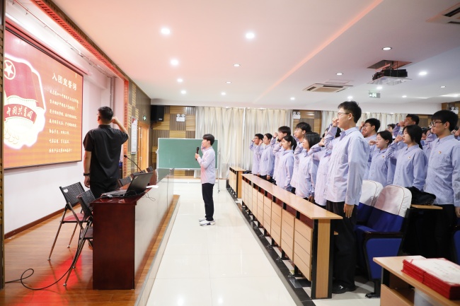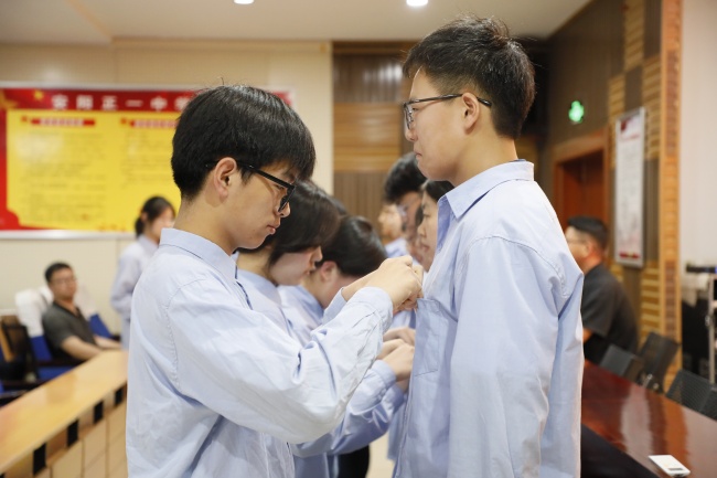 大會(huì)在莊嚴(yán)的國(guó)歌聲中拉開帷幕。團(tuán)總支書記鄧亞楠領(lǐng)誓,100名新團(tuán)員們面向團(tuán)旗莊嚴(yán)宣誓,誓言聲聲洪亮,飽含著對(duì)共青團(tuán)組織的崇敬與向往。老團(tuán)員為新團(tuán)員佩戴團(tuán)徽,閃耀的團(tuán)徽承載著沉甸甸的責(zé)任與使命。老團(tuán)員代表王翼晨結(jié)合自身成長(zhǎng)經(jīng)歷,鼓勵(lì)新團(tuán)員樹立崇高的理想,體現(xiàn)一名團(tuán)員的先進(jìn)性與模范性,為團(tuán)旗增輝添色。新團(tuán)員代表趙一銘表示要繼承發(fā)揚(yáng)共青團(tuán)的優(yōu)良傳統(tǒng),以團(tuán)員的標(biāo)準(zhǔn)嚴(yán)格要求自己,起模范帶頭作用。